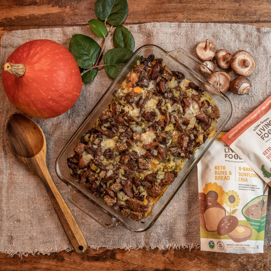 | Both our Sunflower &Pumpkin Keto Breads make THE BEST Gluten Free, Low Carb Stuffing ~ A side dish that everyone will LOVE!! We like to add roasted squash and mushrooms to ensure that our vegetarian guests feel NOURISHED! Serves 6-8 Ingredients: 3 cups Sunflower or Pumpkin Keto Bread ~ cubed 3 tbsp butter or ghee 1 cup leeks or onions, finely chopped 2 stalks celery, finely chopped 1 cup mushrooms, sliced (optional) 1 cup squash ~ butternut or acorn, cubed & roasted (optional) 1/2 tsp garlic powder 1/2 tsp onion powder 2 tsp oregano 1 tsp sage 1 tsp each salt & pepper 1 cup chicken or veggie broth 2 eggs, beaten Mindful Preparation: 1. Make your ‘Keto Croutons’ ~ cube and toast bread or buns. 2. Sauté leeks or onions in butter or ghee over medium heat until softened. 3. Sprinkle with salt, turn to low and caramelize while you prep the rest of your veggies. 4. Add Celery and mushrooms (if using) and herbs, Saute 5-10 more minutes. 5. Combine with Keto Croutons and roasted squash, season with pepper & more salt if needed. 6. Spread into a greased 9×12 baking vessel. Add eggs & broth & cover with tin foil or oven proof lid. 7, Bake at 350 for 35-45 mins. Remove lid, increase temperature to 375 for 10 more minutes. |