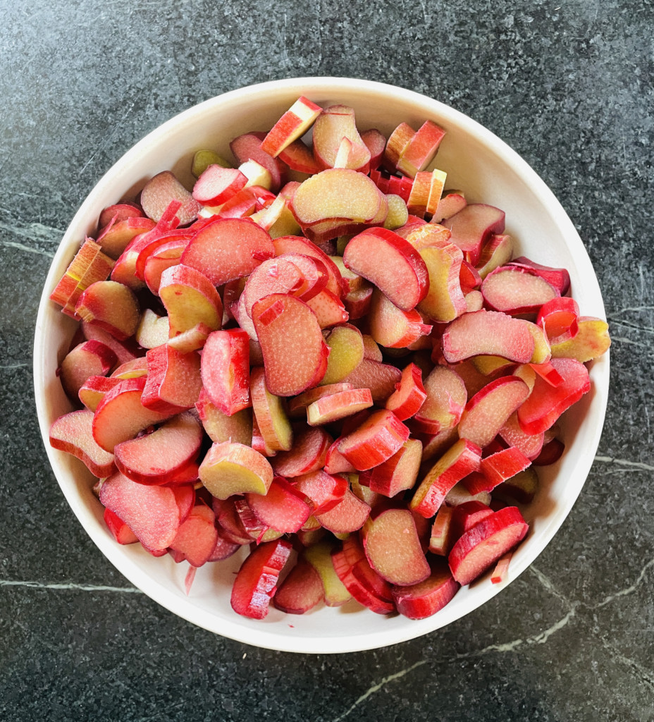 1. First gather your ingredients. If you are harvesting your own rhubarb, remove the leaves and mulch the plant with them.